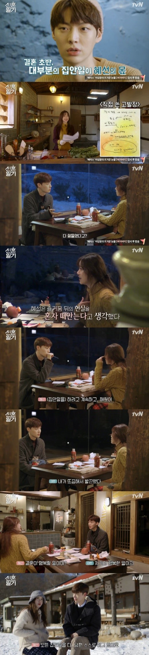 결국 늦은 저녁 마주앉은 두 사람은 대화를 이어나갔다. 안재현은 “여보의 결혼 생활은 최악이었어?"라고 물었고 구혜선은 “그렇지 않다. 좋은 부분이 있기 때문이다. 자기가 나쁘다고 생각했다. 하지만 자기가 나쁘지 않았다는 걸 지금 말하고자 한다. 변하고 있으니 고맙다”고 달랬다. 둘은 대화를 나누며 화해, 다시 기분을 풀었다.