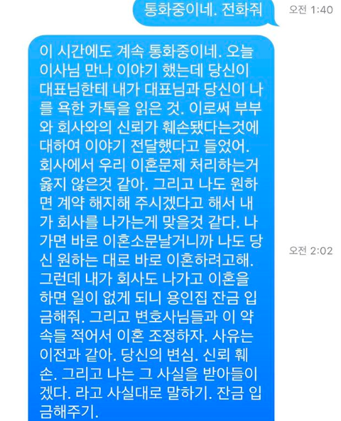특히 구혜선은 안재현에게 보낸 문자 메시지를 추가로 공개, 해당 문자에는 “이사님 만나 이야기 했는데 당신이 대표님한테 내가 대표님과 당신이 나를 욕한 카톡을 읽은 것. 이로써 부부와 회사와의 신뢰가 훼손됐다는 것에 대하여 이야기 전달했다고 들었어. 회사에서 우리 이혼 문제 처리하는 거 옳지 않은 것 같아. 그리고 나도 원하면 계약 해지해 주시겠다고 해서 내가 회사를 나가는 게 맞을 것 같다. 나가면 바로 이혼 소문 날거니까 나도 당신 원하는 대로 바로 이혼 하려고 해. 그런 내가 회사도 나가고, 이혼을 하면 일이 없게 되니. 사유는 이전과 같아. 당신의 변심. 신뢰 훼손. 그리고 나는 그 사실을 받아들이겠다라고 사실대로 말하기”라고 했다.