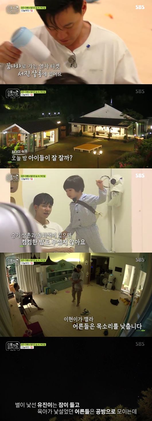 저녁이 됐고, 정소민과 박나래가 아이들 씻기기에 도전했다. 이서진도 젖은 아이들의 머리를 말려주며 다정한 눈빛과 말투로 아이들을 돌봤다. 하루는 마무리 되어갔지만 아이들 재우기는 쉽지 않았다. 아이들 재우기가 최대의 숙제인 상황에 아이들은 "안 졸리다"며 심지어 울기 시작했다. 이승기는 "동화책 읽어주겠다"며 이한이를 품에 안아 책을 읽어줬고, 이서진은 모기향을 피우며 아이들을 챙겼다. 그렇게 조금씩 아이들이 눈을 감으며 취침에 빠졌다.