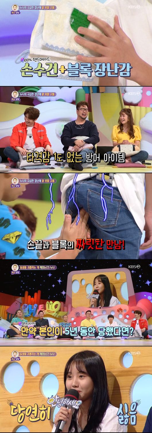 동생은 "누나가 5년 동안 기술이 진화됐다. 똥침을 할 때 손으로 찌르고 손가락을 꺾는다"고 말해 웃음을 자아냈다. 동생은 "도저히 안돼서 똥침 보호대를 만들었다"고 자랑해 눈길을 끌었다.