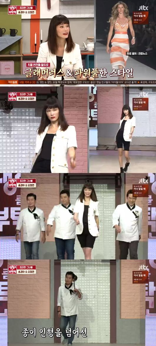이날 MC들은 "뉴욕, 파리, 밀라노, 런던까지 세계 4대 컬렉션을 모두 섭렵한 탑 모델, 경력 23년 차 베테랑'이라며 송경아를 소개했다. 송경아는 뉴욕 패션 진출 1호 모델로 장윤주와 동기라고 밝혔다.