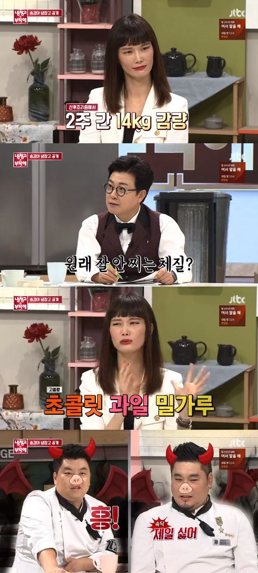 이에 "출산한지 얼마 안됐는데 어떻게 살을 뺀 거냐"란 질문이 이어졌고, 송경아는" 제가 임신중에 16키로 쪘었다. 산후조리원에 2주 있으면서 14키로를 감량했다"고 말해 셰프들의 부러움을 한몸에 받았다.