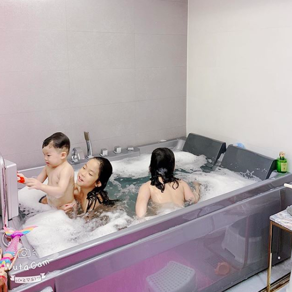 사진 속에서 현영의 아이들이 욕조에서 물놀이를 하고 있는 모습. 특히 아이 세 명이 들어가도 넉넉한 빅사이즈의 욕조 모습이 담겨 있어 눈길을 끈다.
