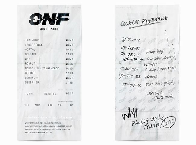 공개된 이미지 2장은 마치 구겨진 영수증의 앞뒷면처럼 보여진다. 'ONF SIGNAL TIMECODE'라고 적힌 첫 티저 속에는 시간이 연상되는 숫자들과 제품명처럼 보여지는 단어들이 마치 암호처럼 조합되어 있다.
