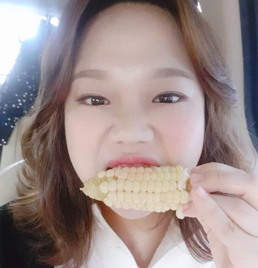 공개한 사진을 보면, 홍현희는 방송을 위한 메이크업을 한 채로 옥수수를 먹고 있다.
