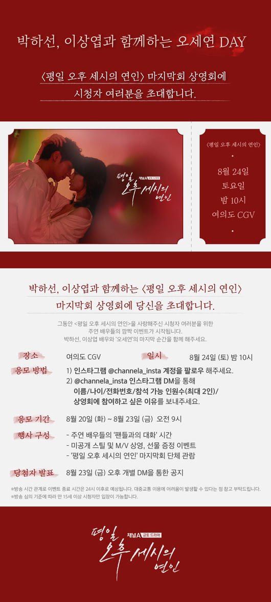 이번 ‘박하선, 이상엽과 함께하는 오세연DAY’ 참석을 원하는 열혈 시청자들은 23일 오전 9시까지 채널A 공식 인스타그램 계정 DM으로 명대사와 ‘단체관람’에 참여하고 싶은 이유, 참석 인원, 개인 정보 등을 보내면 된다. 1인 최대 2매까지 신청 가능하며, 이후 추첨을 통해 선발된 150명이 ‘박하선, 이상엽과 함께하는 오세연DAY’ 단체관람에 참여할 수 있다.