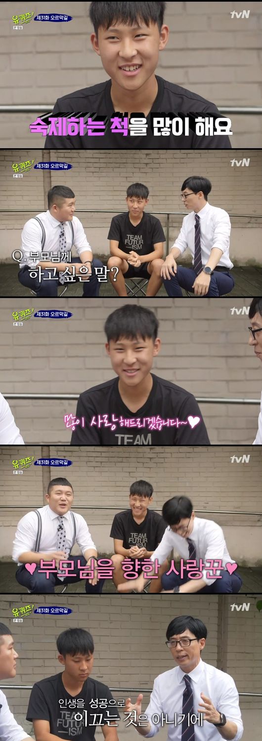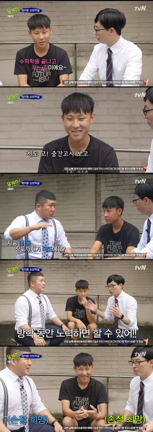준혁군은 공부에 대한 고민을 많이 하고 있다고 토로했다. 이에 유재석은 "100등 안에 드는 건 방학동안 열심히 노력하면 할 수 있다"고 말했다. 그러자 준혁군은 "그럴 수 있는데 지금 방학이 일주일 밖에 안 남았다"고 말해 웃음을 자아냈다.