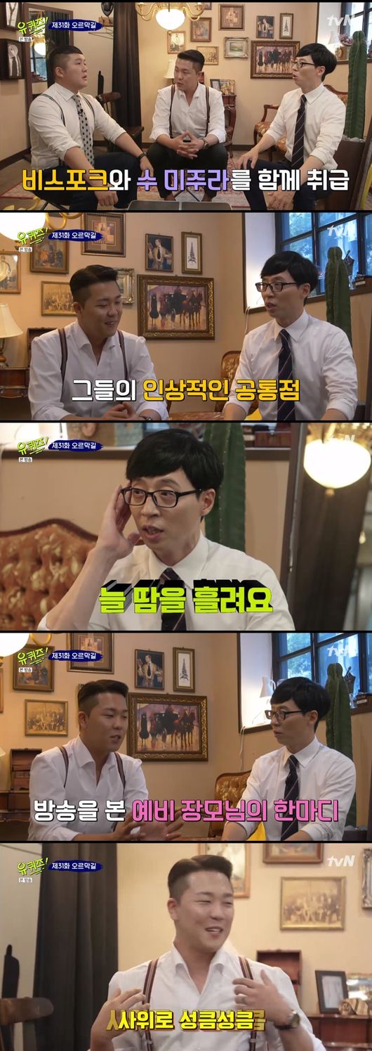 유재석은 "테일러샵에서 만나는 분들을 보면 주로 땀을 흘린다"고 말했다. 조세호는 "셔츠에 땀 얼룩이 지면 섹시해보이는 것 같다"고 말해 웃음을 자아냈다.