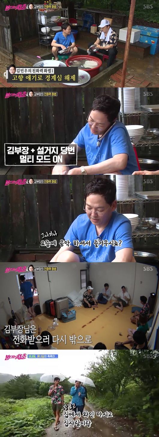 멤버들은 "새친구가 직접 저녁준비를 해왔다고 했다"며 간식거리를 사기로 했다. 설거지를 맡은 김민우는 계속해서 영업전화가 와 부장모드로 변신해 눈길을 끌었다. 김광규가 김민우 설거지를 도왔다. 어색한 분위기 속에서 김민우는 고향얘기로 시작, 친화력 화법을 보였고, 덕분에 김광규와 어색함이 풀어졌다.