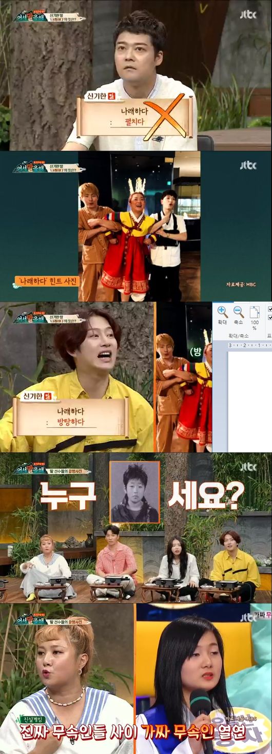 단어 퀴즈는 박나래를 두고 펼쳐졌다. 바로 '나래하다'의 뜻 맟주기. '나래하다'의 뜻은 '죄인을 잡아오다'로 I.O.I의 김소혜가 맞추면서 놀라움을 안겼다. 이어 멤버들은 서로의 이름을 가지고 다양한 의미를 만들어내 웃음을 자아냈다. 공감가는 SNS 시 문제에서는 빈칸을 채우는 퀴즈가 그려졌다.
