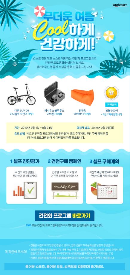 국민체육진흥공단이 발행하는 체육진흥투표권 스포츠토토의 공식온라인 발매사이트인 베트맨(www.betman.co.kr)이 8월 한 달 동안 진행하는 건전화 프로그램 이벤트 ‘무더운 여름 Cool하게 건강하게’게 인기몰이를 하고 있다.