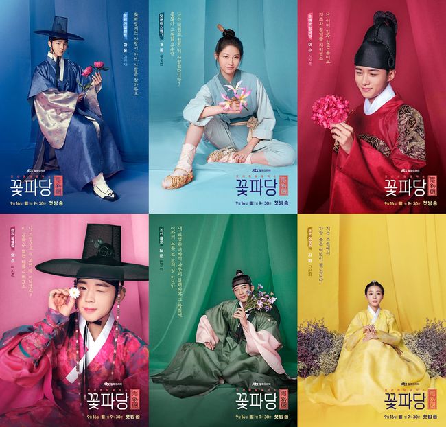 오는 9월 16일 첫 방송 되는 JTBC 새 월화드라마 ‘조선혼담공작소 꽃파당’(극본 김이랑, 연출 김가람)은 여인보다 고운 꽃사내 매파(중매쟁이) 3인방, 사내 같은 억척 처자 개똥이, 그리고 첫사랑을 사수하기 위한 왕이 벌이는 조선 대사기 혼담 프로젝트. 오늘(22일) 공개된 마훈(김민재), 개똥(공승연), 이수(서지훈), 고영수(박지훈), 도준(변우석), 강지화(고원희)의 캐릭터 포스터는 6명의 각양각색 매력과 시선을 끌어당기는 카피, 상징적인 꽃 소품 등을 다채로운 색감 안에 담아냈다.
