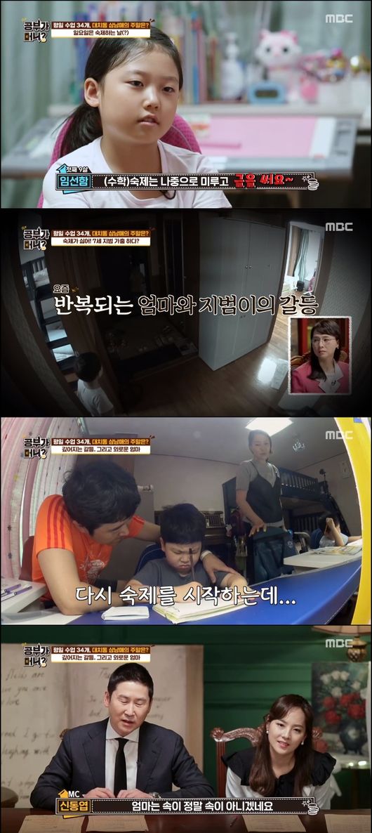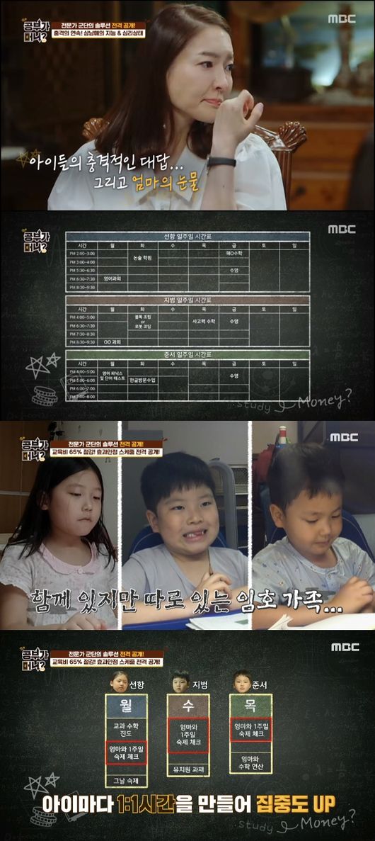 첫 번째 ‘공부가 머니’ 학부모 의뢰인은 ‘왕 전문 배우’ 임호와 그의 아내 윤정희 씨였다. 9세, 7세, 6세 삼남매의 일주일 학원 스케줄은 모두 34개였다. 윤정희 씨는 “처음에는 국영수로 간단히 시작했다. 그러나 욕심이 과해지면서 늘어났고, 남들도 하니까 멈춰지지 않았다. 1년 전부터 수업을 줄여주려고 시도했지만 뺄 게 없었다”고 말했다.
