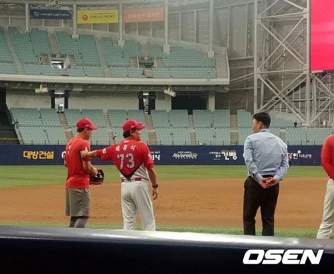 박흥식 감독대행과 이야기를 마친 뒤 이승엽 위원은 그라운드로 잠시 나갔다. 이후 KIA 최원준이 타격 훈련을 마치고 지나갔고, 박흥식 감독대행이라는 '연결고리'로 셋은 이런저런 이야기를 나눴다.