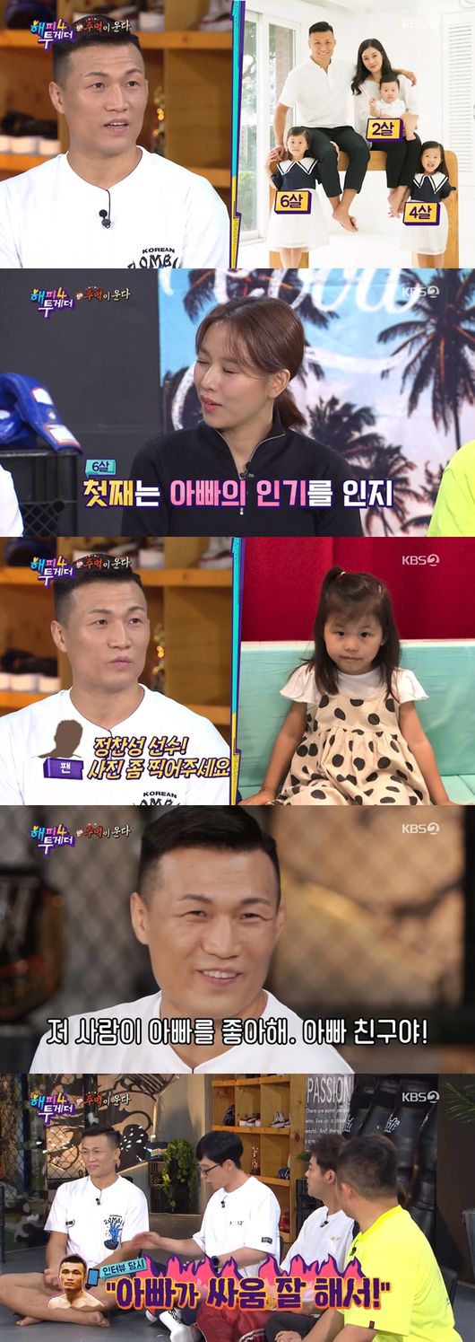 정찬성은 "첫째가 아빠의 인기를 안다"며 "같이 돌아다니면 사람들이 사진 찍자고 말한다. 아이가 왜 아빠랑 사진을 찍냐고 물어본다. 그러면 그냥 친구다라고 말한다"고 말했다.