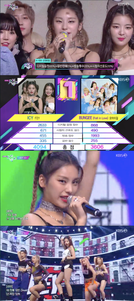 23일 오후 방송된 KBS 2TV '뮤직뱅크'에서 ITZY(있지)의 'ICY’가 1위를 차지했다.