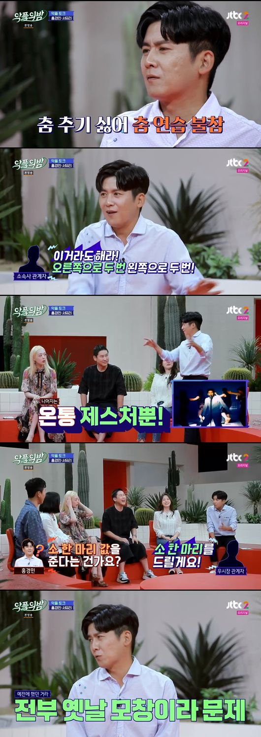 이날 홍경민은 히트곡 메들리를 불렀다. 신동엽은 "춤이 너무 날로 먹는 거 아니냐"고 물었다. 이에 홍경민은 "춤추는 게 싫어서 연습을 안 갔다. 그래서 나중에 소속사에서 이거라도 하라고 하더라"고 말해 눈길을 끌었다.