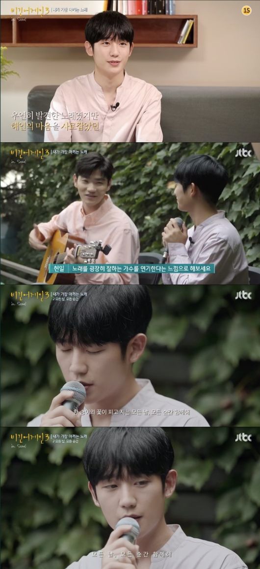 더불어 정해인은 헌일, 하림의 연주에 맞춰 북촌에서 버스킹을 시도했다. 시종일관 손을 떨며 가만 있지 못하던 정해인이었지만 노래를 시작하자 긴장을 풀기 위해 노력하고 무대에 임했다. 결국 두 사람은 연주로 함께 한 사람들을 넘어 '비긴어게인3' 전 멤버들에게 감탄의 박수를 받았다. / monamie@osen.co.kr