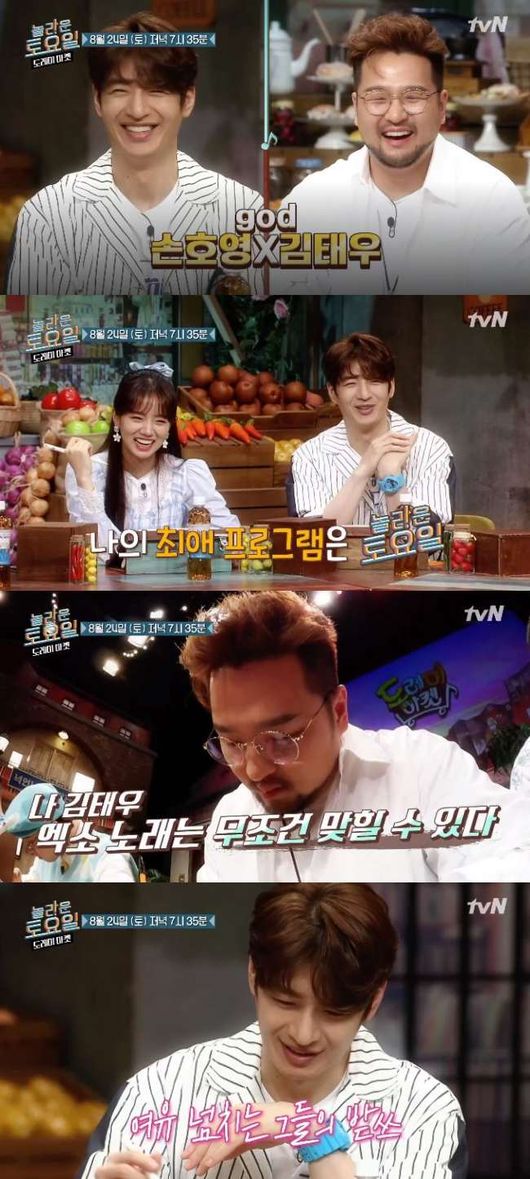 24일 오후 방송되는 케이블채널 tvN 예능프로그램 '놀라운 토요일 - 도레미 마켓'에서는 원조 아이돌 god의 손호영과 김태우가 스튜디오를 찾아 뜨거운 환영을 받았다. 손호영은 “‘놀토’를 꼭 챙겨본다. 특히 박나래의 푸드연구소 코너를 좋아해서 항상 같이 푼다”고 말해 웃음을 안겼다. 김태우는 “지난 방송을 모니터링해보니 생각보다 맞히기가 어려웠다”면서도 “최애 가수인 EXO 노래가 나오면 해 볼만 할 것 같다”는 소감을 밝혀 눈길을 끌었다.