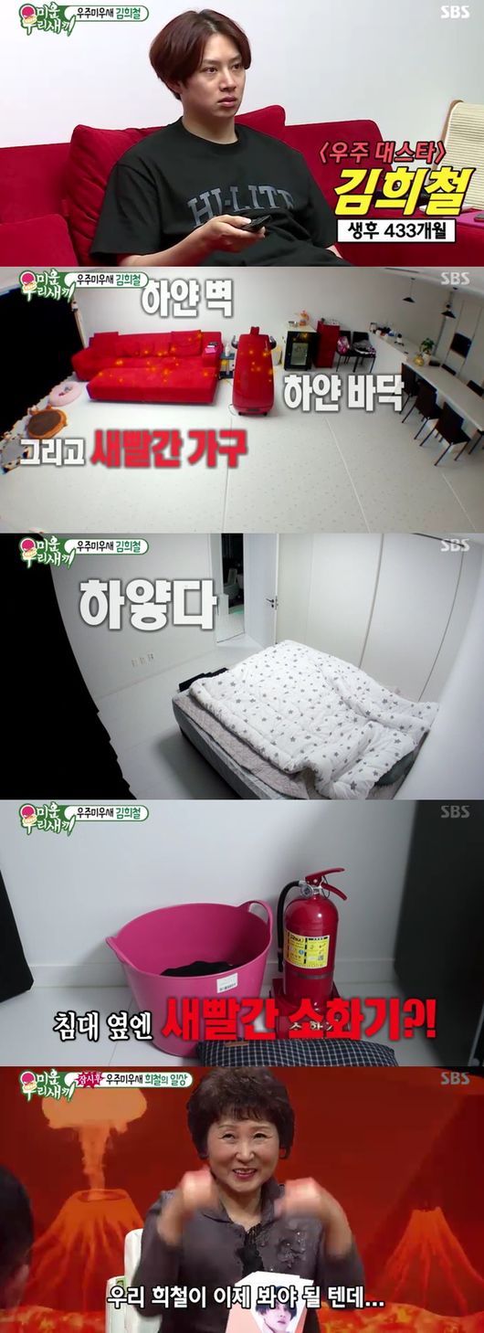 본격적으로 우주미우새 김희철 일상을 들여다봤다. 母는 걱정가득한 표정으로 바라봤다. 무엇보다 김희철 집이 최초 공개, 하얗 인테리어에 빨간색 포인트인 가구가 눈길을 끌었다. 게다가 빨간 소화기가 침실에 있어 눈길을 끌었다.