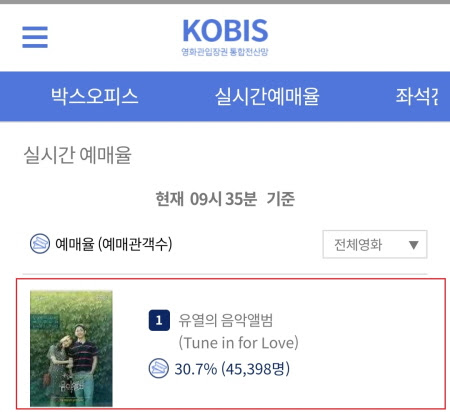 다가오는 가을 새로운 감성과 사랑을 불어넣을 영화 '유열의 음악앨범'이 26일 오전 9시 30분 기준, 영진위 통합전산망 실시간 예매율에서 예매율 30.7%, 사전 예매량 4만 5,398장을 기록하며 압도적 예매율 1위를 기록하고 있다.
