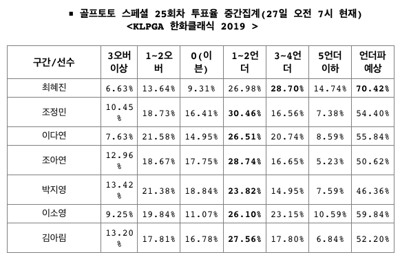 국내 골프팬들은 ‘KLPGA 한화클래식 2019’ 1라운드에서 최혜진의 언더파 가능성을 가장 높게 내다봤다.