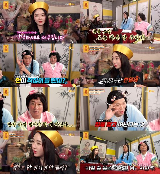 지난 26일 방송된 KBS Joy 오리지널 콘텐츠 ‘무엇이든 물어보살’ 23회에서는 배우 서우가 콩콩보살로 변신해 선녀보살 서장훈, 아기동자 이수근과 함께 열정 솔루션으로 안방극장을 사로잡았다.