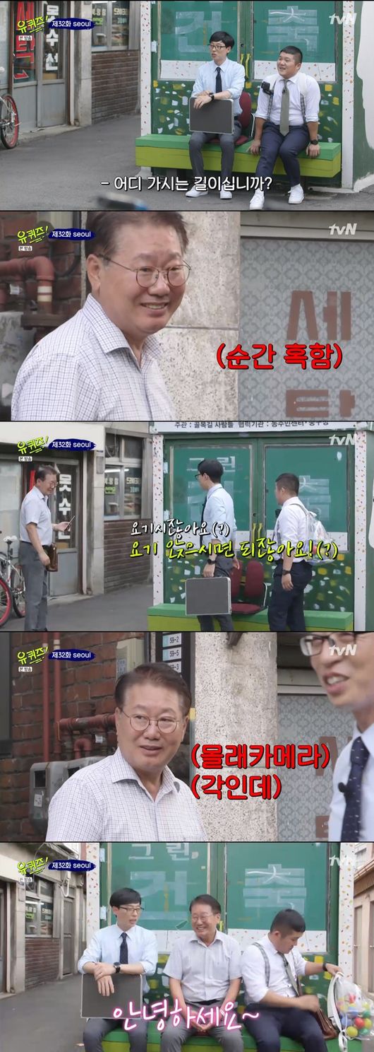 이날 유재석과 조세호는 더위에 지쳐 벤치에 앉아 있다가 집으로 퇴근중인 류근오씨를 만났다.