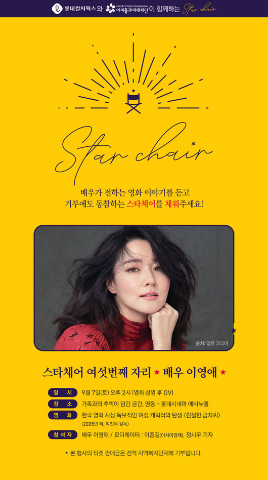 배우 이영애가 롯데컬처웍스의 대표 사회공헌활동인 '해피앤딩 스타체어'의 여섯 번째 주인공으로 낙점됐다. 해피앤딩 스타체어는 배우와 관객 사이의 대화 창구를 마련함과 동시에 아이들의 꿈과 미래를 응원하고 나눔 문화를 조성하기 위해 마련된 사회공헌활동이다.