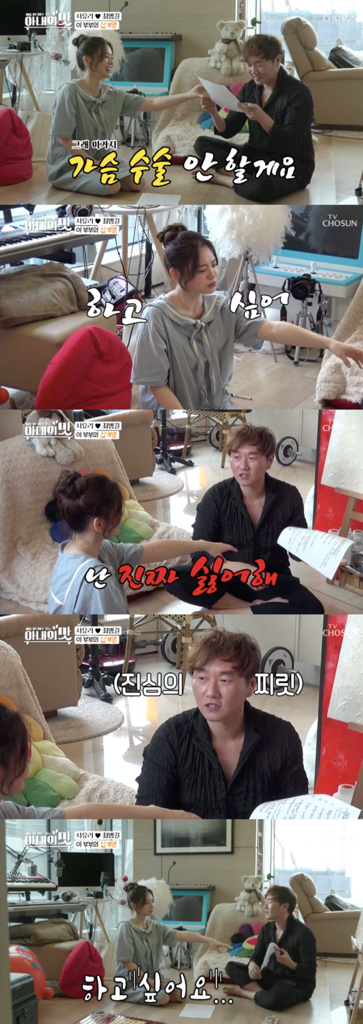 그리고 마지막으로 최병길은 서유리의 부부십계명 마지막 항목을 보고는 “이거 마음에 든다”며 “가슴 수술 안 할게요”라고 말해 놀라움을 자아냈다. 서유리는 “하고 싶다"고 했고 최병길은 “하지마. 나 진짜 싫어한다”고 단호하게 말했다. 서유리는 계속해서 하고 싶다고 했지만 최병길은 강력하게 반대했다.