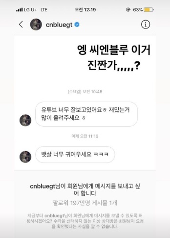 박민정은 이종현으로 추정되는 인물이 보낸 메시지 캡처와 함께 "엥 씨엔블루 이거 진짜인가?"라는 문구를 덧붙였다. 누가 봐도 의아하다는 반응이다.