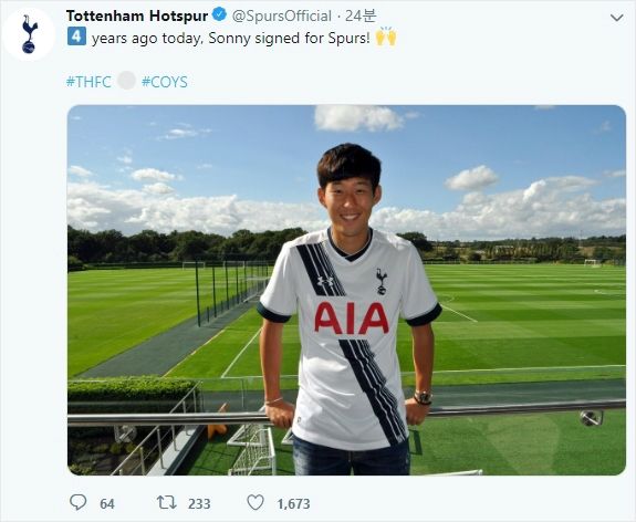 토트넘은 28일(한국시간) 공식 SNS를 통해 손흥민 영입 4주년을 기념하는 글과 사진을 올렸다. 당시 사진 속 손흥민은 환한 미소와 함께 지금보다 풋풋한 모습으로 매력을 더했다.