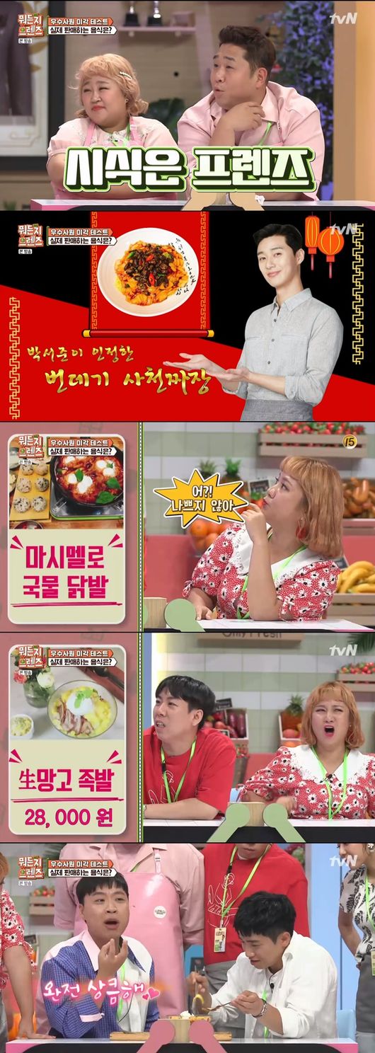 프렌즈들은 각자 메뉴 한 개씩을 골라 시식했다. '마시멜로 국물 닭발'을 먹은 문세윤은 "먹을 것 갖고 장난치면 안된다"고 말했다. 하지만 홍윤화는 "나는 먹을만하다"라고 말해 눈길을 끌었다.