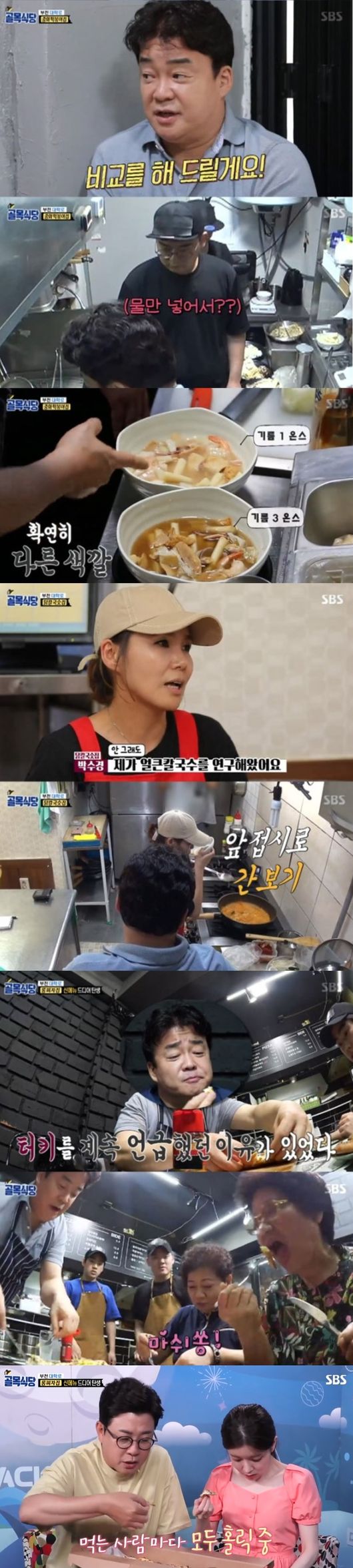 닭칼국수집도 연구한 얼큰칼국수를 백종원에게 선보였다. 하지만 평가는 좋지 못했고, 결국 백종원이 직접 같은 재료에 고춧가루만 추가한 다른 레시피로 얼큰칼국수를 만들어냈다. 이를 맛본 사장님은 “딱 제가 좋아하는 맛이다. 맛있다”고 감탄했다. 백종원은 사장님의 단점 중 하나였던 수시로 간 보는 것에 대해서도 지적하며 ‘일정한 간을 위해 양념장을 대용량화할 것’을 제시했다.