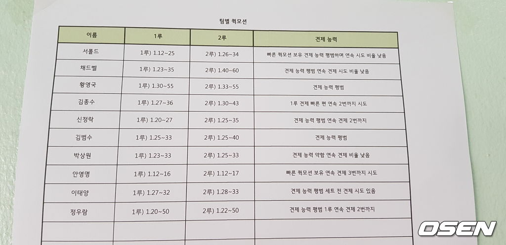 이날 선발로 나온 서폴드는 1루 퀵모션은 1.12~1.25초, 2루 퀵모션은 1.26~1.34초로 분석했다. ‘빠른 퀵모션 보유, 견제 능력은 평범하며 연속 시도 비율이 낮음’이라고 설명했다. 30일 선발인 채드 벨은 1루 1.23~1.35초, 2루 1.40~1.60초였다. 퀵 모션이 조금 느린 편이다.