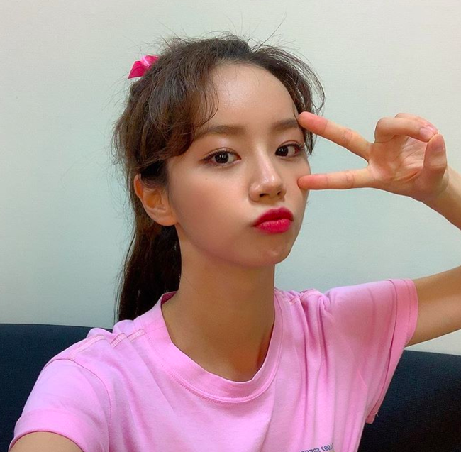공개된 사진을 보면 분홍색 반팔 티셔츠를 입고 애교 섞인 표정을 짓고 있는 혜리가 눈에 들어온다. 손가락으로 브이를 그리는가 하면, 미소를 띤 채 카메라를 정면으로 응시했다.