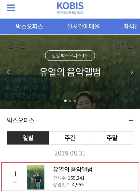 레트로 감성멜로 '유열의 음악앨범'이 영진위 통합전산망 일일 박스오피스 기준, 8월의 마지막인 8월 31일, 박스오피스까지 1위를 차지하며 4일 연속 박스오피스 정상을 유지했다. 영화 '유열의 음악앨범'은 4일 간 누적 관객수 53만 9,293명을 돌파하며 '건축학개론'이 4일간 동원한 관객수 49만 2,579명보다 빠른 속도로 흥행 가두를 달리고 있다.