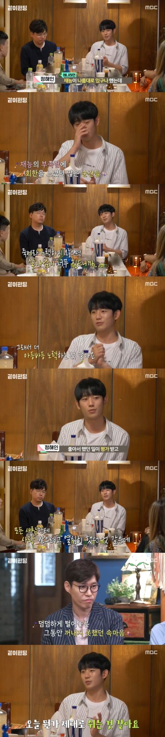 정해인은 "좋아했던 일이 평가 받고, 보여지는 직업이다 보니까, 지칠 때가 있더라. 보이는 것에 대해서..그래서 계속 숨고 싶은 생각이 들때가 있었다. 누군가 만나는 게 두렵다. 나도 사실 댓글을 다 본다. 안 볼 순 없다. 모든 사람한테 사랑 받으려고 열심히 했던 것 같은데, 그게 날 스트레스 받게 했던 것 같다. 그리고 사실 지금 드라마 '봄밤'을 끝내고 제대로 된 휴식이 없었는데, 오늘 제대로 쉬는 것 같다. 서로의 생각을 듣고, 다 공감하지는 못하지만, 어느 부분이라도 같은 생각을 하는 것에 대해 위로를 받았다. 이 시간이 소중하고 진짜 행복한 것 같다"며 미소를 지었다.