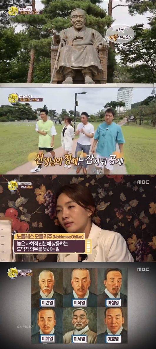 이어 선녀들은 남산에서 마주한 동상에 대해 물어봤다. 앞서 설민석이 식사할 때 이야기해주기로 한 것. 설민석은 노블레스 오블리주를 설명하며 이시영 명문가의 6형제에 대해 이야기했다. 설민석은 "당시 이시영의 둘째 형 이석영이 영의정 양자로 들어가 천억대 재산을 유산으로 상속 받았다. 그런데 갑자기 나라를 빼앗긴 거다. 6명 형제는 단 한명의 반대 의견도 없이 독립 자금으로 쓰자고 했다"라고 전했다.