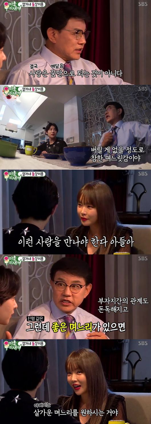 설운도는 "부부라는게 살다보니 처음엔 환성적이었지만 이게 안 된다"며 환상과는 다른 결혼의 현실을 전했다. 사랑은 꿈이 아니라 현실이라고. 그러면서 홍진영을 향해 "진영이가 후배지만 정말 버릴게 없을 정도로 참한 며느릿감"이라며 홍진영을 향한 애정을 드러냈다. 특히 "부모를 공경하는 마음이 참 보기 좋아, 살가운 며느리 원한다"면서 "그런 며느리라면 하루 12번도 업어주겠다"고 덧붙였다.