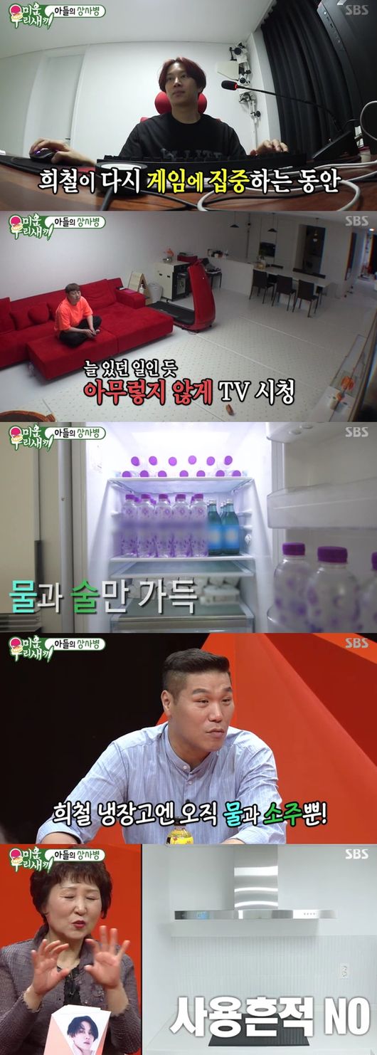 김희철이 게임에 집중하는 동안 친한 동료연예인인 개그맨 이진호가 집을 방문했다. 진호가 왔음에도 김희철은 "냉장고에 뭐 알아서 먹고 있어라"며 게임에 집중해 폭소하게 했다.이진호는 기대를 안고 냉장고를 봤으나 소주와 물 뿐이었다. 이를 본 母도 속상해하며 걱정했다.