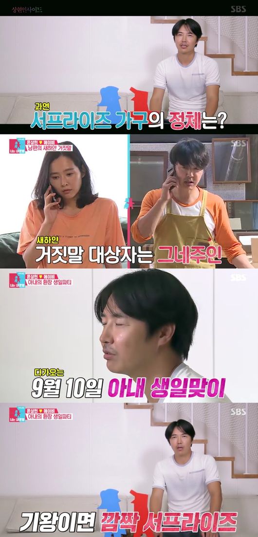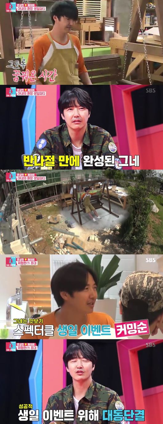 윤상현이 아내 메이비를 위해 목수오빨 변신했다. 서프라이즈 가구 이벤트를 준비, 마스크까지 풀장착하며 열중했다. 직접 디자인한 그네까지 설계도에 따라 천천히 모양을 갖췄다. 알고보니 아내 메이비를 위한 그네였다.