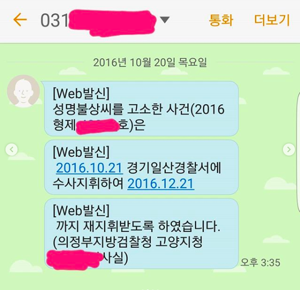박연수는 2일 자신의 SNS에 고소장 접수증과 함께 누군가와 대화한 메시지 내용을 공개했다.