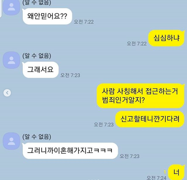 공개된 메시지에서 박연수는 누군가는 "왜 안믿어요?"라고 말하고 이에 박연수는 "사람 사칭해서 접근하는 거 범죄인 거 알지?"라고 대답한다. 이에 누군가는 다시 "그러니까 이혼해가지고"라며 다시금 공격한다.