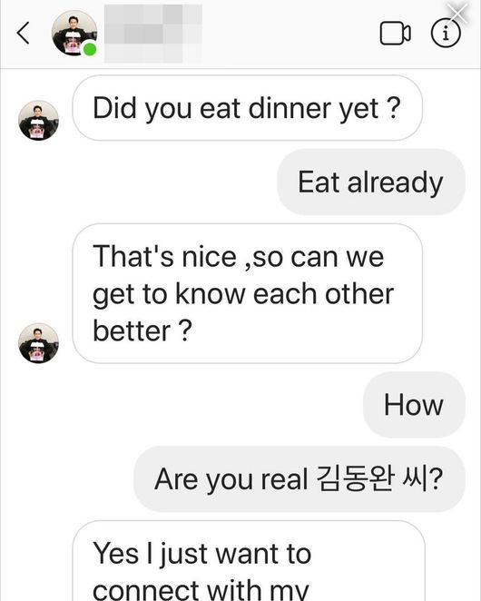 이와 함께, 김동완은 사진 한 장을 공개했다. 바로 팬이 김동완의 사칭범과 대화를 나눈 내용을 캡처한 것. 사칭범은 팬에게 자연스럽게 안부를 물으며 접근하는 방식을 택했다.