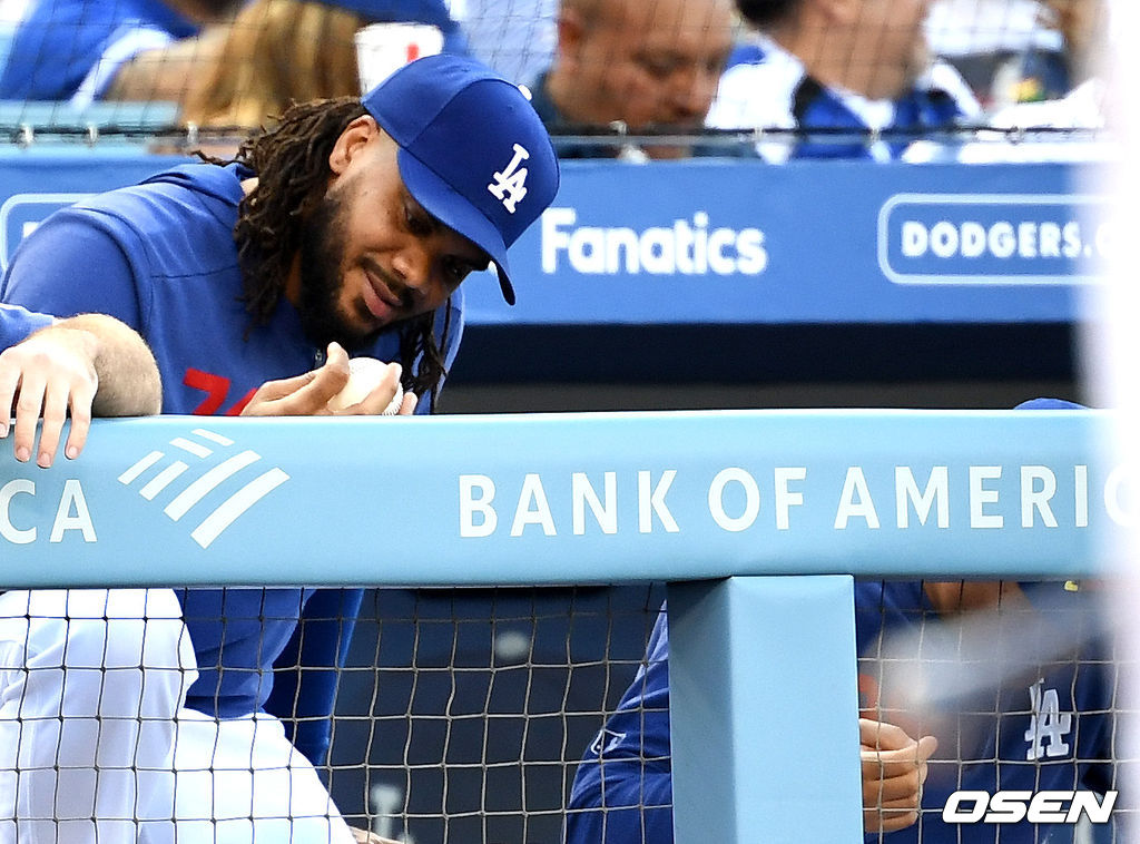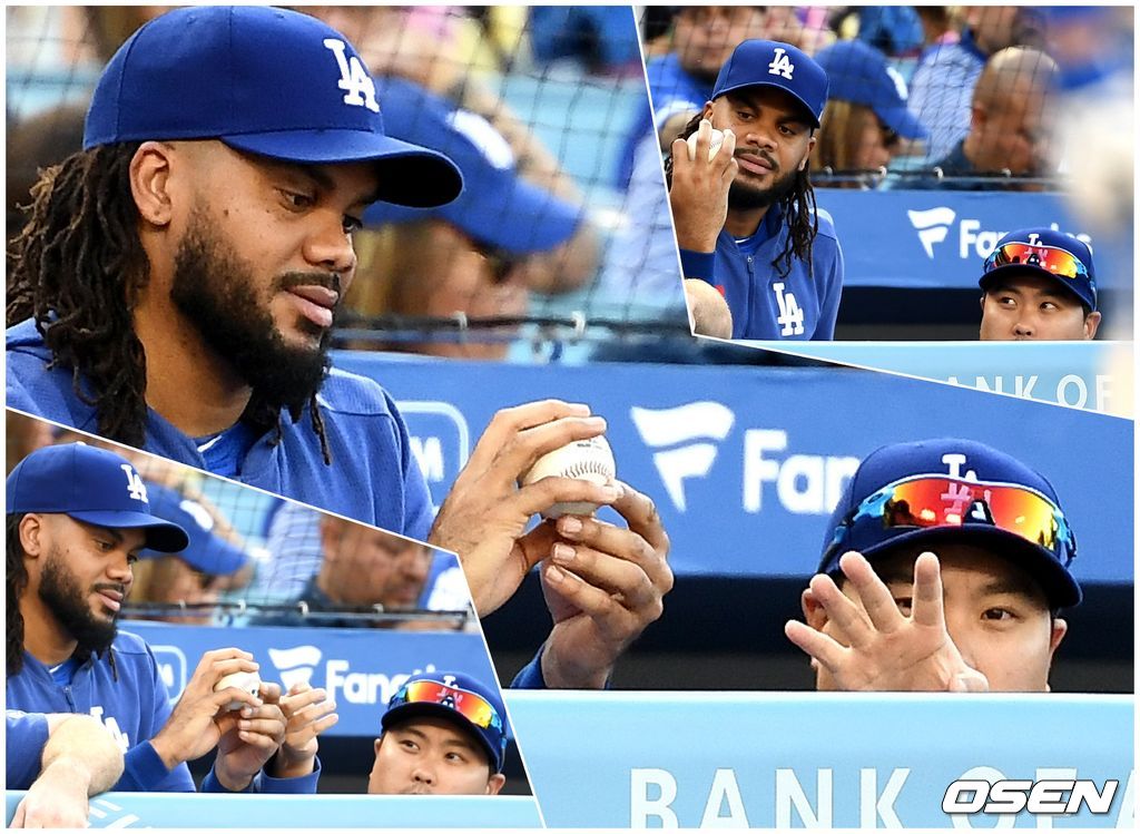 '알고도 못치는' 류현진의 체인지업 그립을 배운 다저스 마무리투수 켄리 잰슨은 의미 심장한 미소로 그립을 한참 바라봤다. /dreamer@osen.co.kr