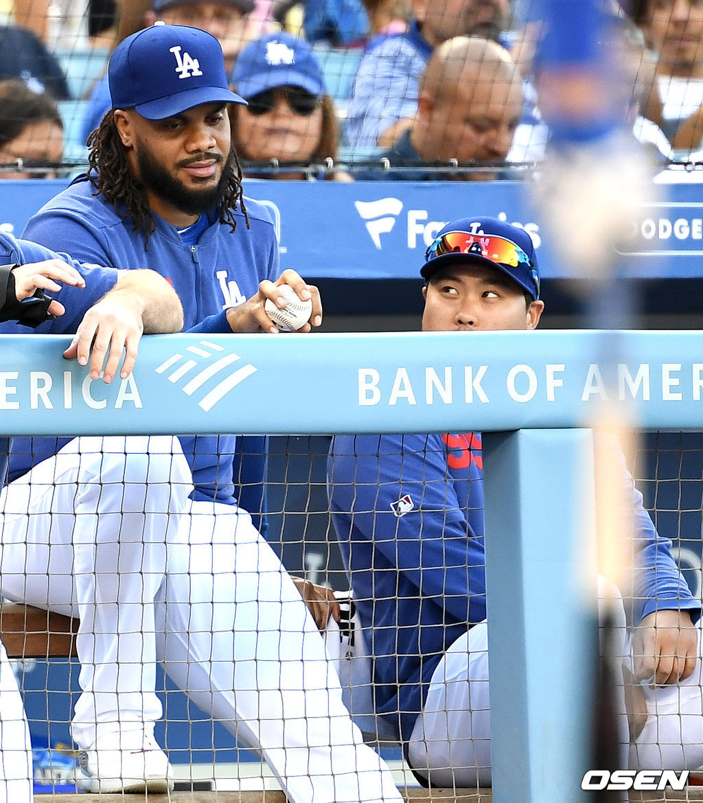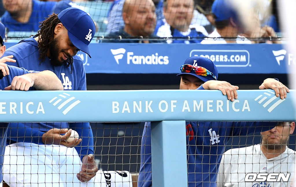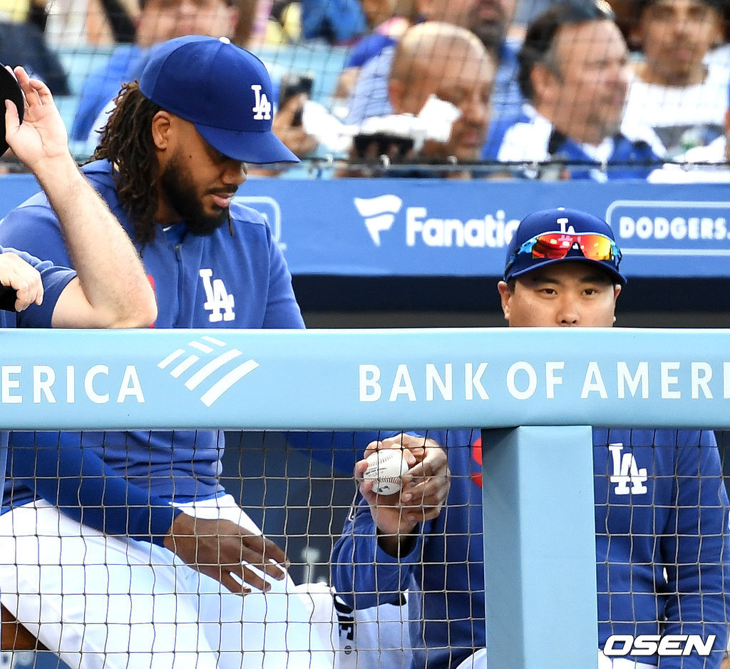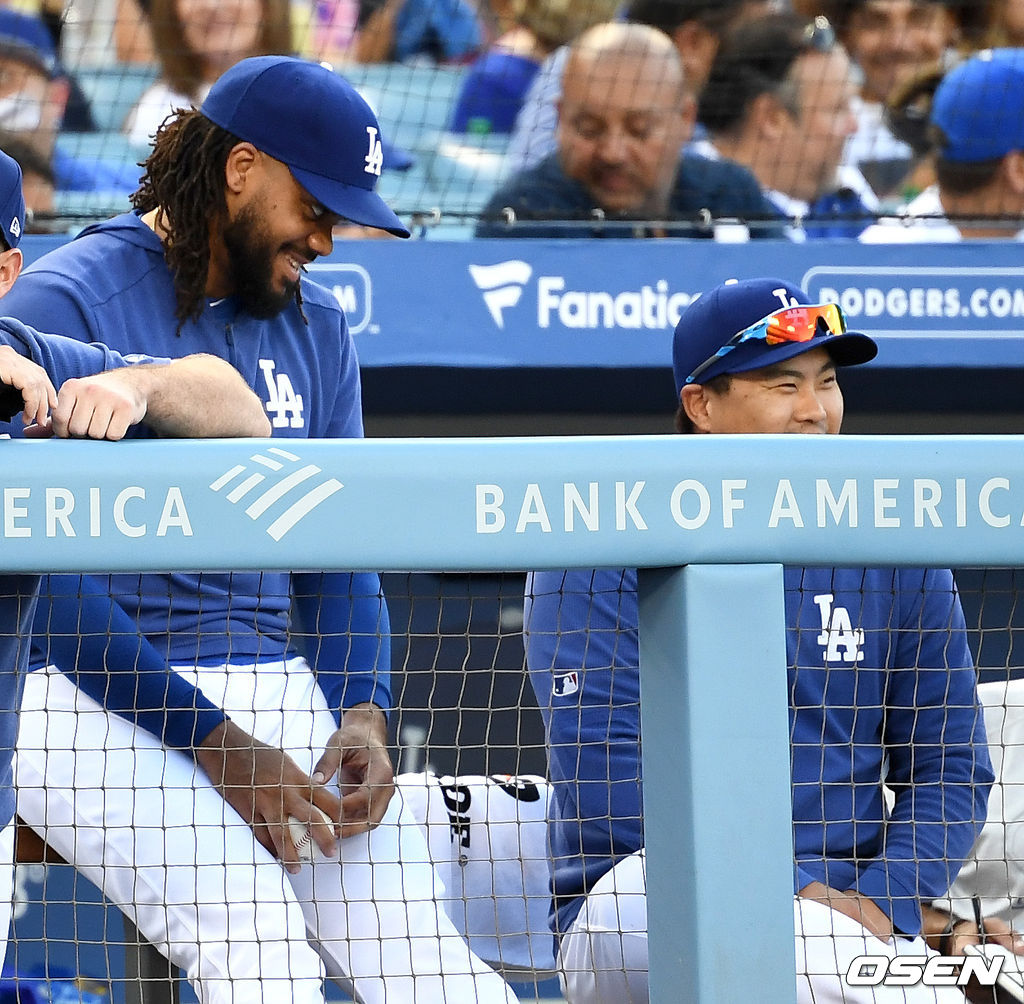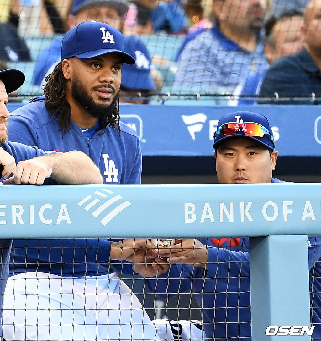 3일(이하 한국시간) 미국 캘리포니아주 로스앤젤레스 다저스 스타디움에서 열린 콜로라도 로키스와의 홈경기, 더그아웃에 나란히 앉은 류현진과 켄리 잰슨은 그라운드를 바라보며 이야기를 나눴다.