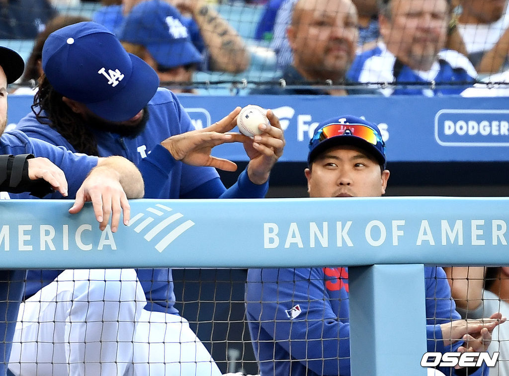 일반적인 더그아웃의 풍경인 줄 알았던 순간, 류현진과 잰슨이 함께 그립을 잡았다.