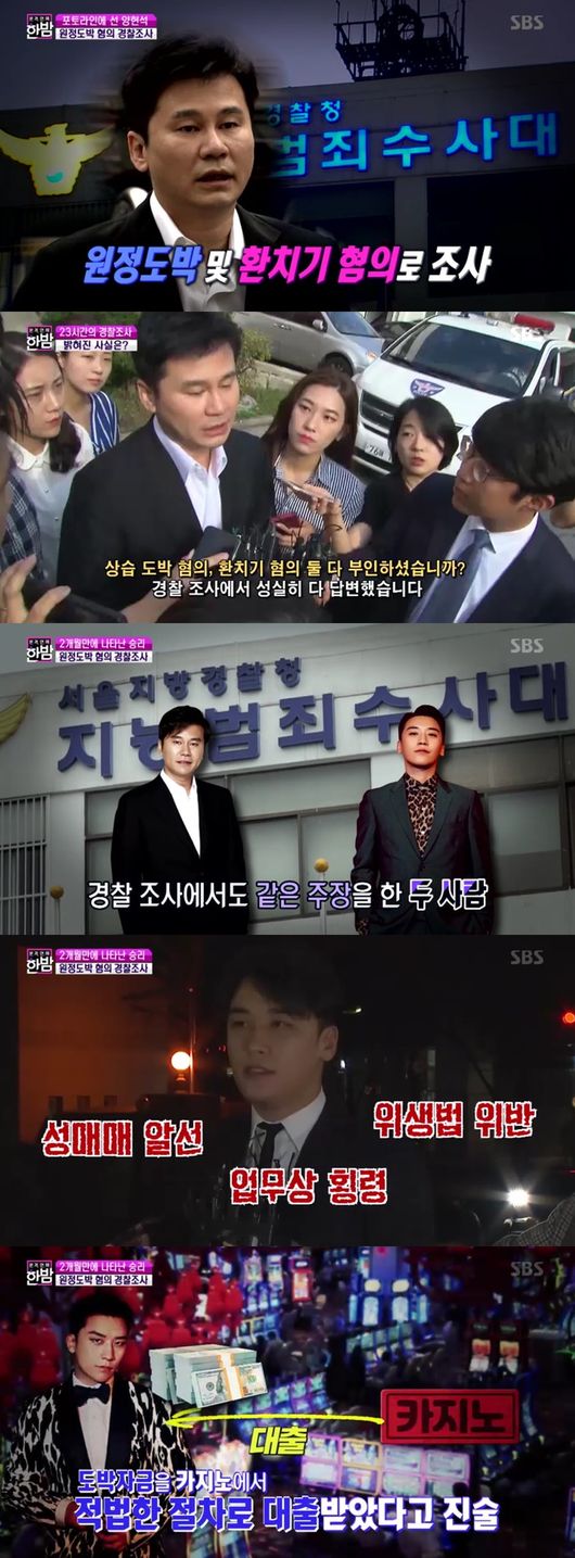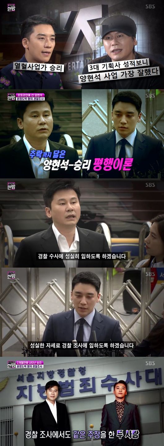 가요계 선후배 이자 YG 소속사 대표와 가수였던 양현석과 승리가 추락까지 닮은 평행이론을 보였다. 지난 8월 29일, 서울 지방 경찰청 앞에 모습을 비춘 양현석 전 대표가 그려졌다. 모자를 벗고 말쑥한 정장차림으로 경찰에 출석한 양현석은 처음 포토라인에 서면서 해외 원정도박 혐의와 도박 자금 환치기 혐의, 그리고 외국 성접대 의혹에 대해서 "경찰 수사에 성실히 임하겠다"면서 준비된 대답만 되풀이했다.