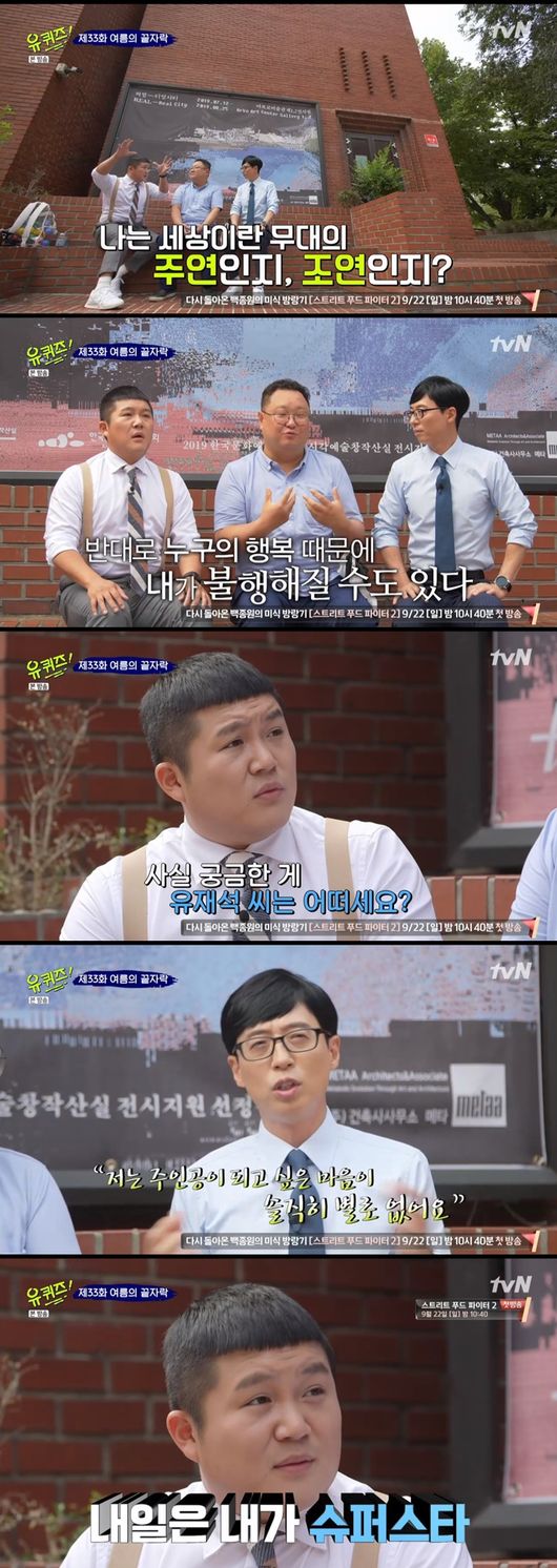 이날 유재석과 조세호는 마로니에 공원에서 시민인 박우곤 대표를 만나 이야기를 나눴다. 유재석은 박우곤 대표에게 "나는 세상이라는 무대에서 주연이라고 생각하나, 조연이라고 생각하나"라고 물었다.